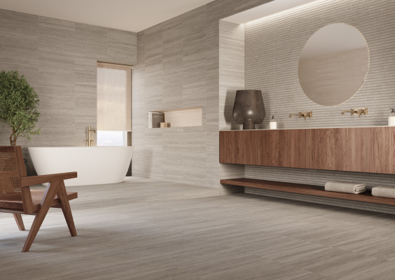 La réinterprétation de la pierre de Portland. Une surface élégante et moderne qui anticipe les tendances esthétiques et fonctionnelles du moment.